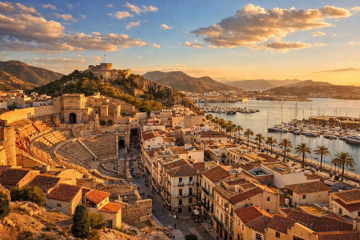 La fundaron los cartagineses en el 227 a.C. y los romanos la convirtieron en una de las ciudades más importantes de Hispania. Esa historia se ve hoy: el Teatro Romano se descubrió en 1988 bajo la Catedral Antigua y es el segundo más grande de España. El Castillo de la Concepción domina la ciudad desde un cerro con vistas a los cinco montes que la rodean. Y el modernismo de principios del siglo XX dejó fachadas como el Gran Hotel o el Casino en plena Calle Mayor.